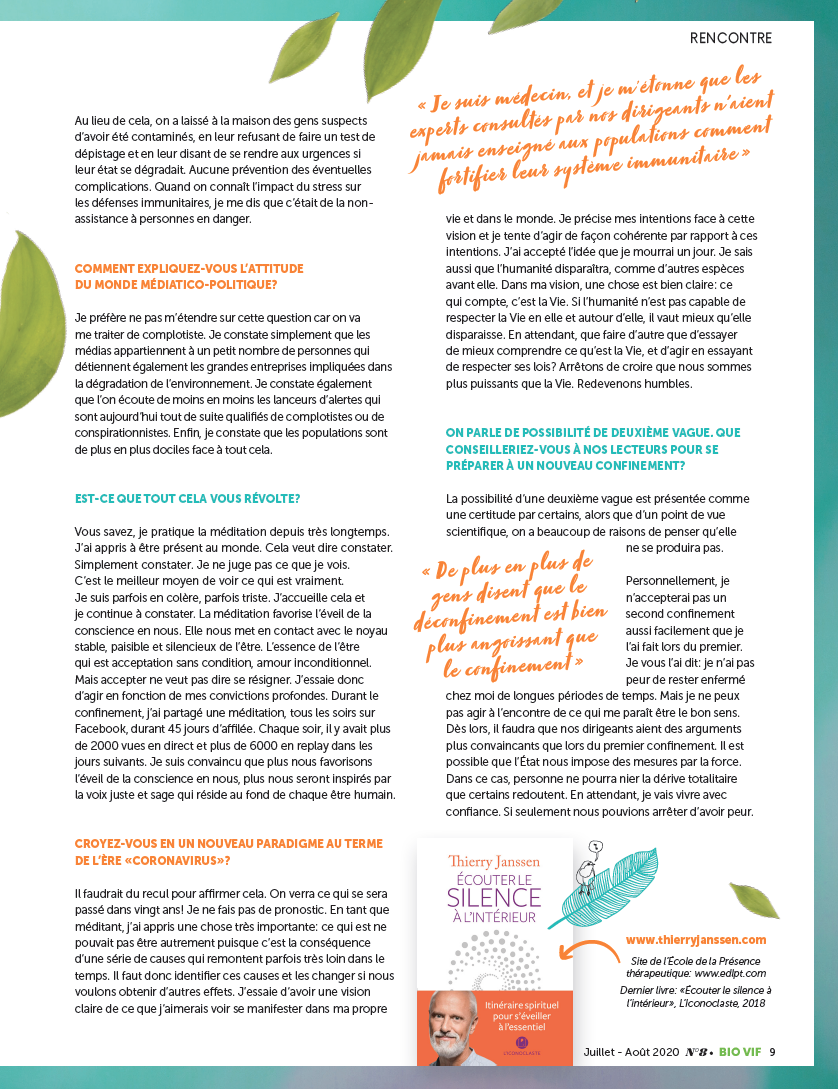 Chirurgien devenu psychothérapeute spécialisé dans l’accompagnement des patients atteints de maladies physiques, Thierry Janssen est l’auteur de plusieurs livres consacrés à une approche globale de l’être humain, au développement de ce que l’on appelle la « médecine intégrative » et à une vision plus spirituelle de la société (www.thierryjanssen.com). Il enseigne au Centre universitaire SigmundFreud, à Paris (www.sfu-paris.fr) et il est le fondateur de l’École de la présence thérapeutique, à Bruxelles (www.edlpt.com).