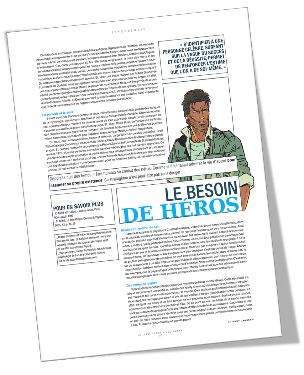 Divinités de la mythologie, ancêtres idéalisés ou figures légendaires de l’Histoire, les héros de notre imaginaire représentent une source d’inspiration fertile. Celle-ci nous invite au dépassement de nous-même. Le stimulus est puissant, indispensable peut-être. Dès lors, certains sociologues s’interrogent. Car, dans une époque où les références religieuses, le culte des morts et les connaissances historiques s’estompent, les nouveaux héros de la presse people remplacent peut-être les modèles exemplaires du passé. Le succès de certains magazines semble confirmer cette hypothèse. Aurions-nous besoin d’être fascinés par l’un ou l’autre personnage emblématique ? De nombreux psychologues pensent que oui. Et, selon une étude réalisée par Robert Deaner de l’université de Durham, nous partagerions cette propension avec nos cousins les singes. En effet, des macaques mâles adultes préfèrent se passer de nourriture plutôt que d’être privés de la possibilité de contempler des photographies des mâles dominants de leur groupe. En revanche, regarder les photos des mâles dominés ne les intéresse guère. L’attrait pour les stars de la horde se révèle donc une priorité. Et Deaner a montré que cette attirance est au moins aussi importante que l’intérêt manifesté pour les organes sexuels des femelles de l’espèce !